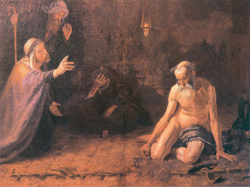 „Verd meg őt csontjában…” – mondja tovább a Sátán. A Sátán azt mondja Jóbbal kapcsolatban, hogy az embernek igen is fontosak a külső értékek, ezeket el is vette tőle, de a legnagyobb értéke az élete. Isten azt nem engedi meg, hogy életét elvegye, mert olvastuk, az életéthez nem nyúlhatsz. Hát, akkor marad az egészsége. Csúnya fekélyekkel borította be a testét a Sátán.