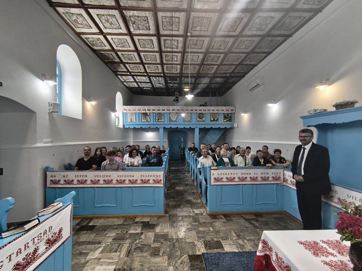 Utána egy hosszabb utazás várt ránk Sarmaságig, ahol bőséges, ízletes ebéddel láttak vendégül bennünket. Innen Szilágylompértra vezetett utunk, ahol Bogya Árpád lelkipásztor mutatta be a református templom egyedi kazettás mennyezetének néhány különleges részletét.