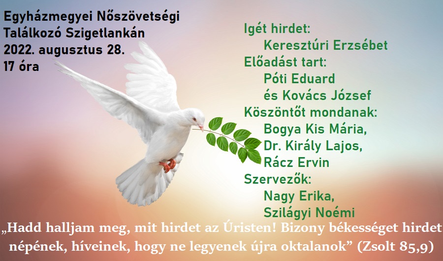 Szeretettel hívjuk és várjuk egyházmegyénk gyülekezeteinek nőtagjait, lelkészfeleségeket és missziós munkatársakat lelkipásztoraik kíséretében az augusztus 28-án, vasárnap délután 5 órától kezdődő Egyházmegyei Nőszövetségi Találkozóra, a Szatmárnémeti Szigetlankai gyülekezet templomába.